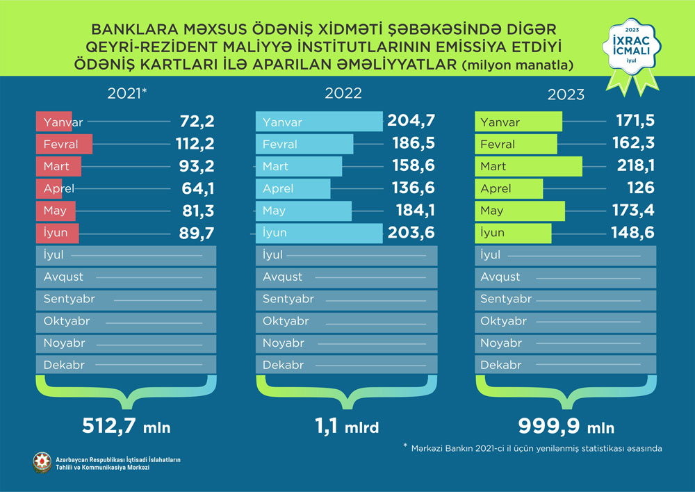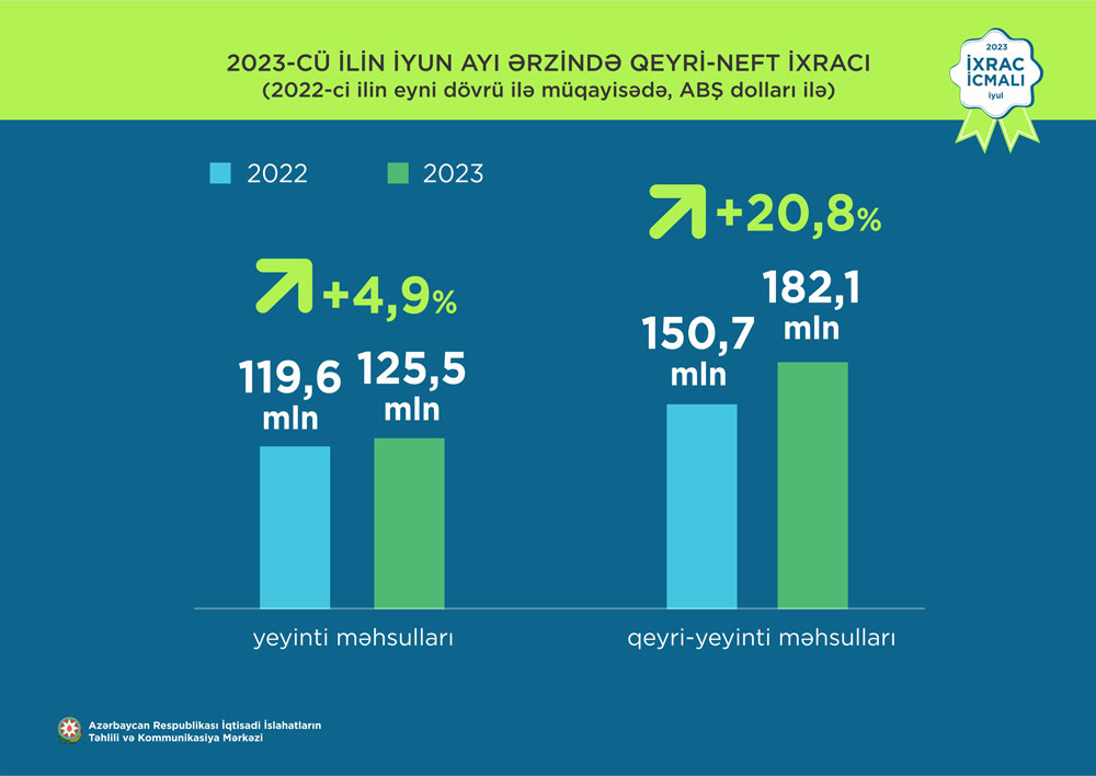 2023-cü ilin iyun ayının qeyri-neft ixracı ötən ilin müvafiq dövrü ilə müqayisədə 13,8% artaraq 307,6 milyon ABŞ dolları təşkil edib. 2023-cü ilin iyun ayı ərzində yeyinti məhsulları üzrə ixrac 4,9% artaraq 125,5 milyon ABŞ dolları, qeyri-yeyinti məhsulları üzrə isə 20,8% artaraq 182,1 milyon ABŞ dollarına bərabər olub.