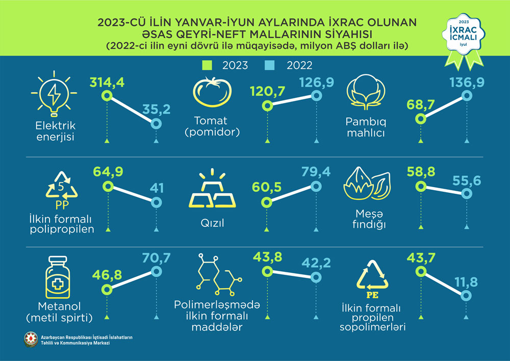 2023-cü ilin yanvar-iyun ayları ərzində ixrac edilən qeyri-neft sektoruna aid malların siyahısında elektrik enerjisi (314,4 milyon ABŞ dolları) birinci olub. Bu siyahıda pomidor (tomat) (120,7 milyon ABŞ dolları) ikinci, pambıq mahlıcı (68,7 milyon ABŞ dolları) isə üçüncü yerdə qərarlaşıb.