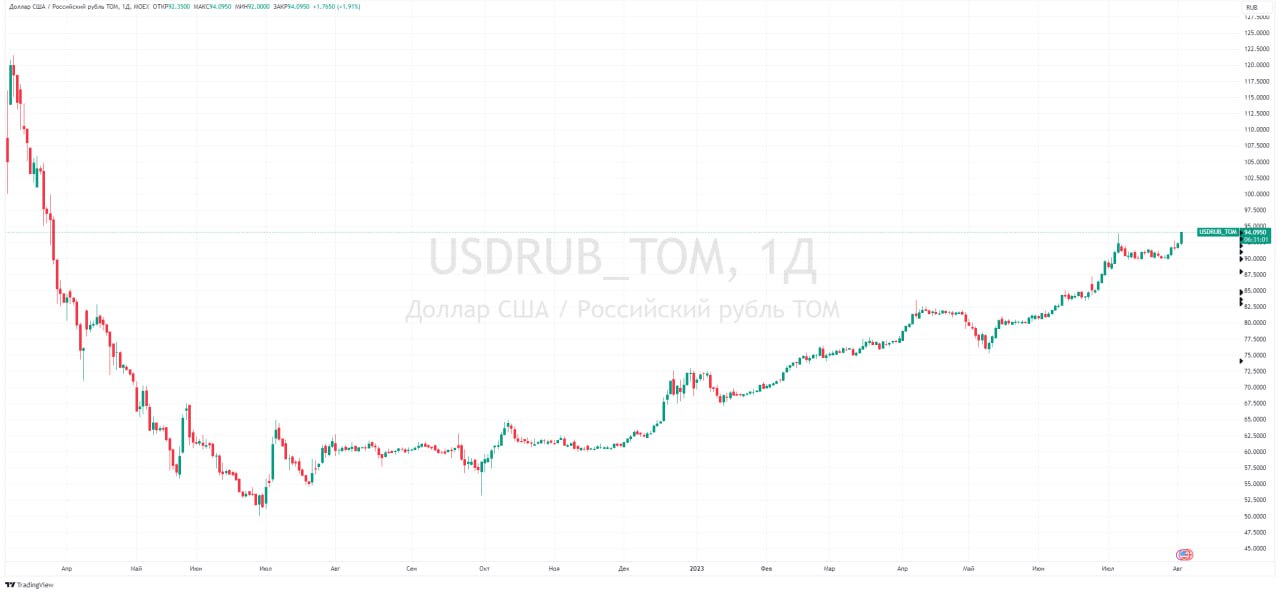 Avqustun 2-də ticarət zamanı dolların məzənnəsi 94 rublu ötüb: bu, 2022-ci ilin martından bəri maksimumdur.