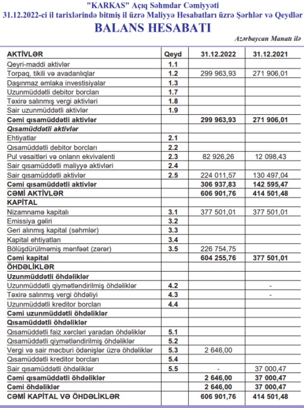 31 dekabr 2022-ci il tarixində "Karkas" ASC 606 min 902 manat cəmi aktivlərə malik olub. Şirkət 2021-ci ilin sonunda 414 min 501 manat cəmi aktivlərə malik idi.