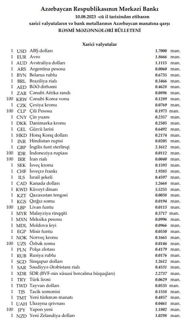 Mərkəzi Bank rəsmi məzənnələri açıqladı