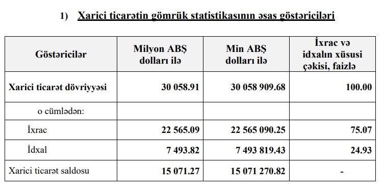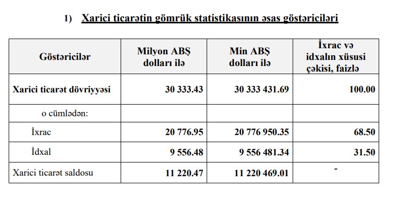 Xarici ticarətin gömrük statistikasının əsas göstəriciləri açıqlanıb.