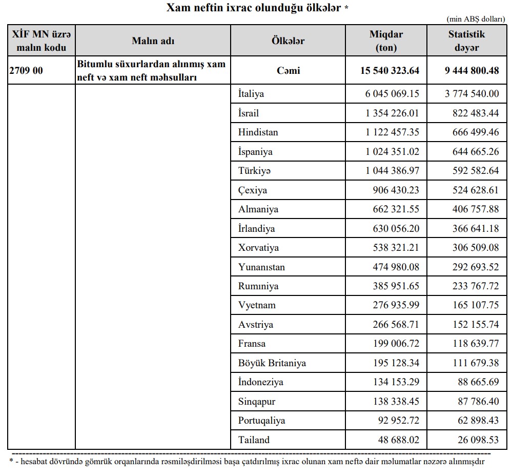Dövlət Gömrük Komitəsi Azərbaycan xam neftinin ixrac olunduğu ölkələri açıqlayıb.