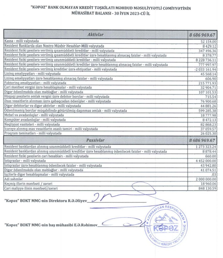 "Kəpəz" Bank Olmayan Kredit Təşkilatı 2023-cü ilin birinci yarısını (yanvar-iyun) 848 min manat mənfəət ilə başa vurub.