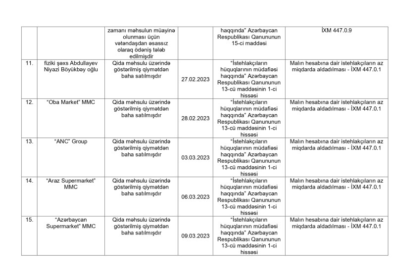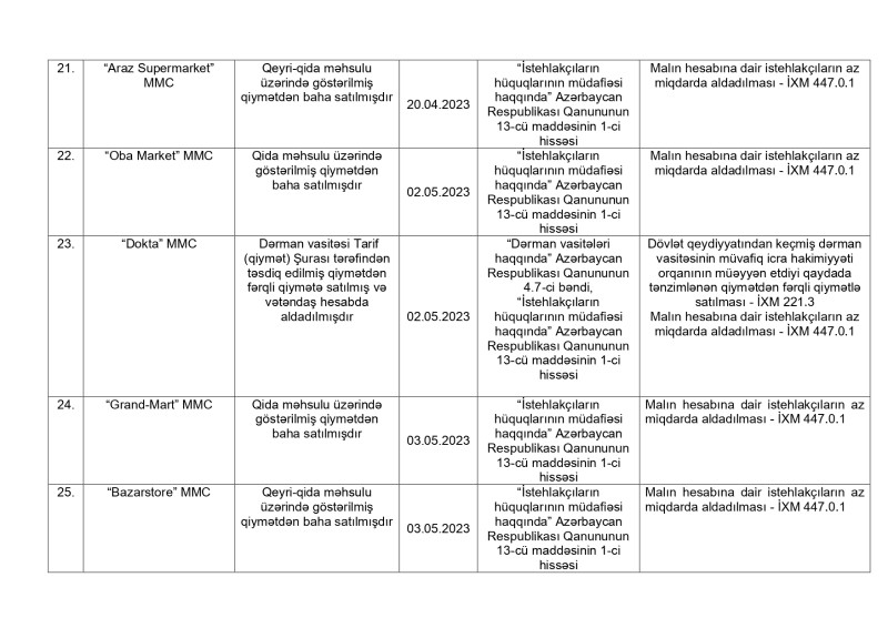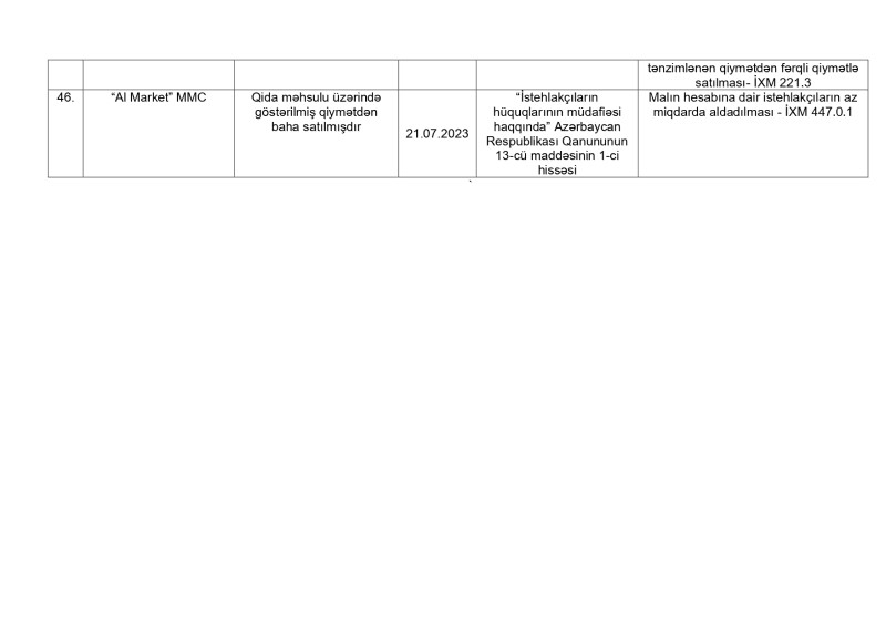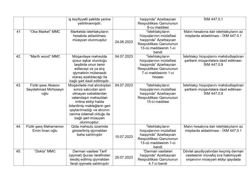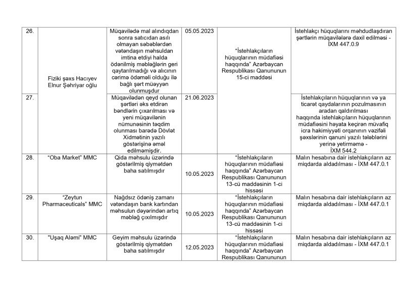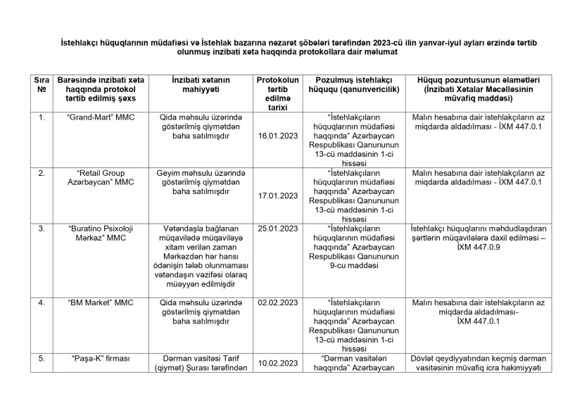 Antiinhisar və İstehlak Bazarına Nəzarət Dövlət Xidmətinin İstehlakçı hüquqlarının müdafiəsi və İstehlak bazarına nəzarət şöbələri tərəfindən 2023-cü ilin yanvar-iyul ayları ərzində tərtib olunmuş inzibati xəta haqqında protokollara dair məlumatlar açıqlanıb.