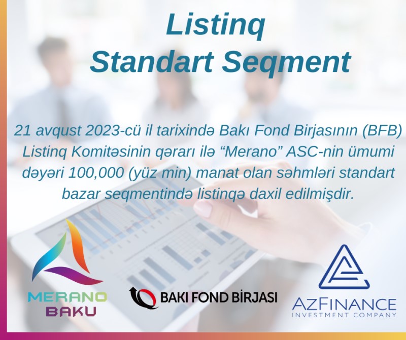 21 avqust 2023-cü il tarixində Bakı Fond Birjasının (BFB) Listinq Komitəsinin qərarı ilə “Merano-Baku” ASC-nin ümumi dəyəri 100 min manat olan səhmləri standart bazar seqmentində listinqə daxil edilmişdir.