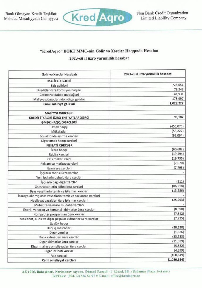 "KredAqro BOKT" 2023-cü ilin ilk 6 ayını xalis mənfəət ilə başa vurub