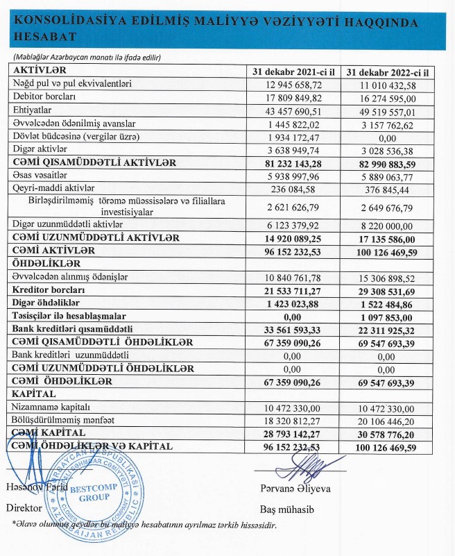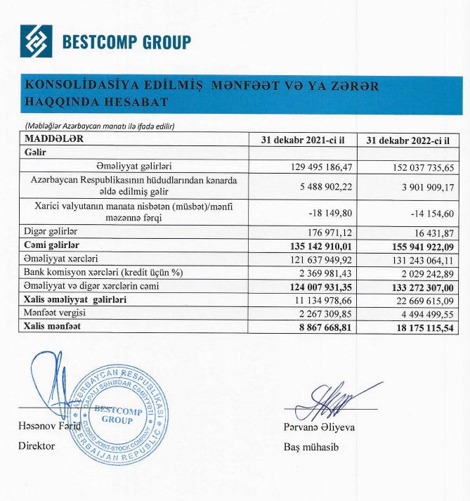 Digər gəlirlər daxil "Bestcomp Group"un ötən il cəmi gəlirləri 155 milyon 942 min manat olub (2021-ci ildə 135 miylon 142 min manat).