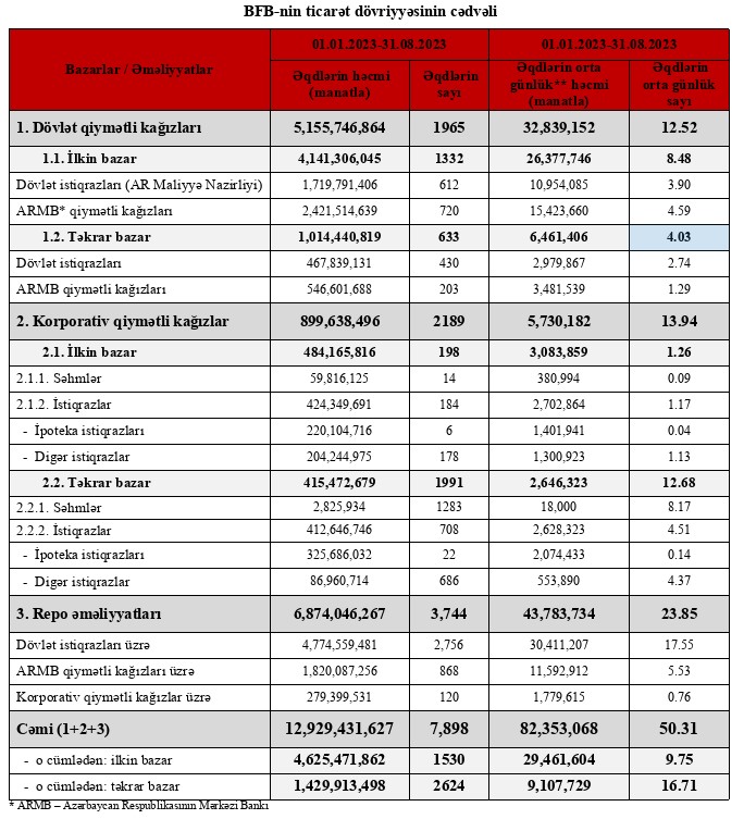 Bakı Fond Birjasında 2023-cü ilin yanvar-avqust ayları ərzində qiymətli kağızlar üzrə keçirilən əməliyyatların ümumi həcmi 12 milyard 929 milyon 432 min manat təşkil etmişdir və ötən ilin müvafiq dövrü ilə müqayisədə 50% artım qeydə alınmışdır.
