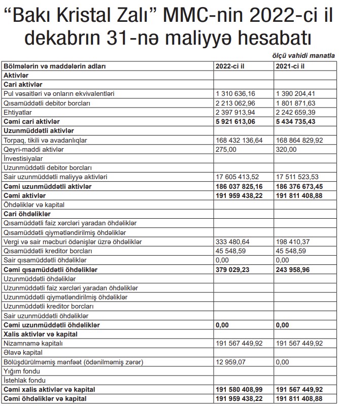 31 dekabr 2022-ci il tarixində “Bakı Kristal Zalı” 17 milyon 592 min manat yığılmış zərərə malik olub.
