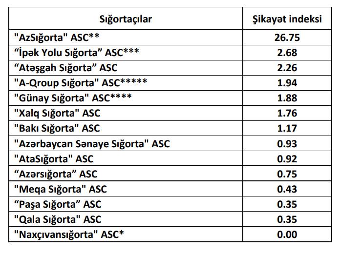 Avto-icbari sığorta üzrə şikayət indeksinə (Sentyabr 2022 - Avqust 2023) görə, xidmət səviyyəsi "AzSığorta" ASC, “İpək Yolu Sığorta” ASC, “Atəşgah Sığorta” ASC, "A-Qroup Sığorta" ASC, "Günay Sığorta" ASC, "Xalq Sığorta" ASC və "Bakı Sığorta" ASC şirkətlərində aşağı olub.