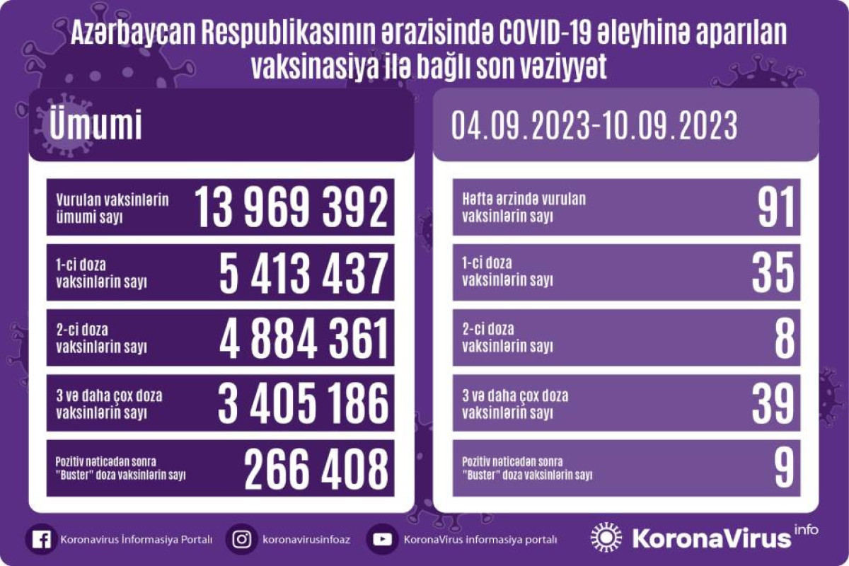 Azərbaycanda sentyabrın 4-dən 10-dək koronavirus (COVID-19) əleyhinə 91 vaksin vurulub.