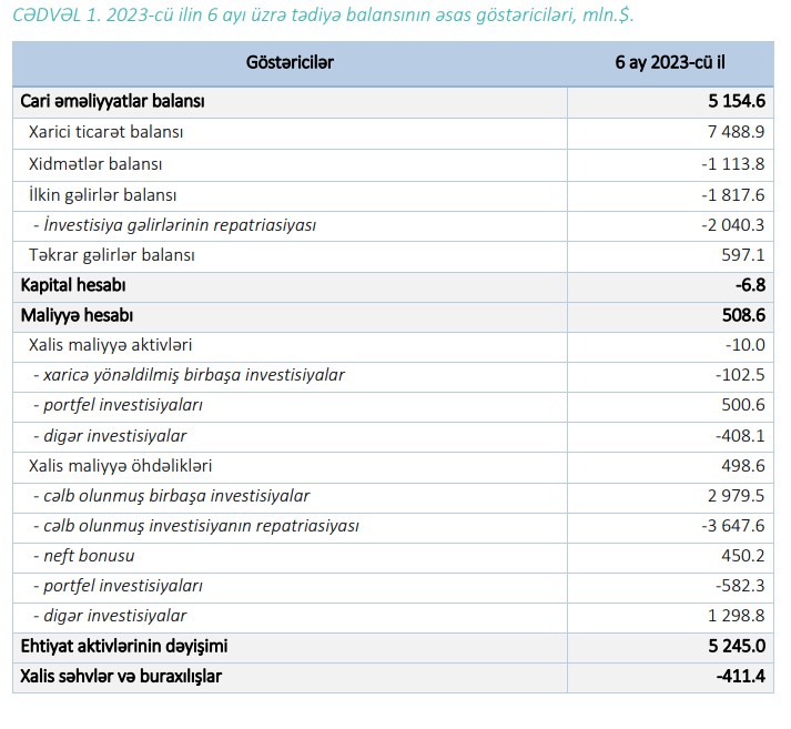 Azərbaycanın cari əməliyyatlar balansının profisiti 2 dəfə azalıb.2023-cü ilin 6 ayı üzrə tədiyə balansı əsasən neft və qaz qiymətlərinin əlverişli olması, qeyri-neft-qaz ixracının artması və kapitalın və maliyyənin hərəkəti hesabında müsbət meyllərdən təsirlənmişdir. Cari əməliyyatlar balansında 5 milyard 155 milyon dollar, kapital və maliyyənin hərəkəti hesabında isə 509 milyon dollar profisit yaranmış, ehtiyat aktivləri 5 milyard 245 milyon dollar artmışdır. Bu dövrdə xam neftin orta qiyməti 81 dollar/barel olmuş, qeyri-neft-qaz ixracı isə 23% artaraq 1.7 milyard dollar səviyyəsində formalaşmışdır.