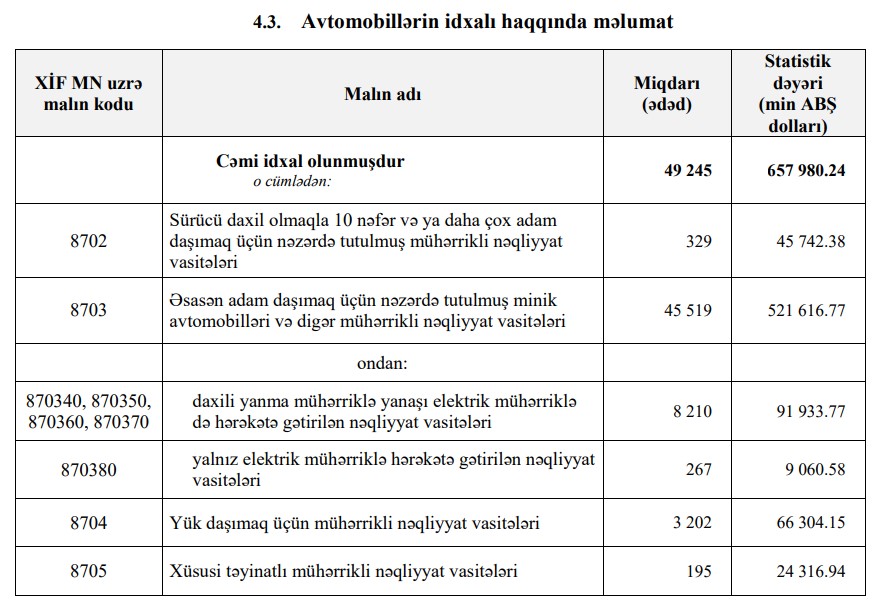 Qeyd edək ki, 2022-ci ilin yanvar-avqust dövründə Azərbaycana 657 milyon 980 min dollar dəyərində 49 min 245 ədəd avtomobil idxal olunmuşdu.