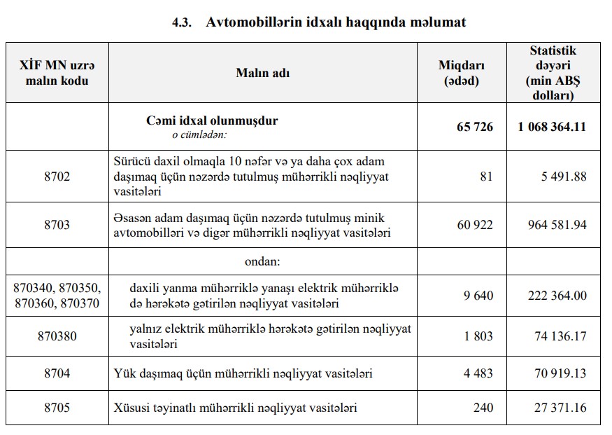 2023-cü ilin yanvar-avqust dövründə (8 ayda) Azərbaycana 1 milyard 68 milyon 364 min dollar dəyərində 65 min 726 ədəd avtomobil (nəqliyyat vasitəsi) idxal edilib.