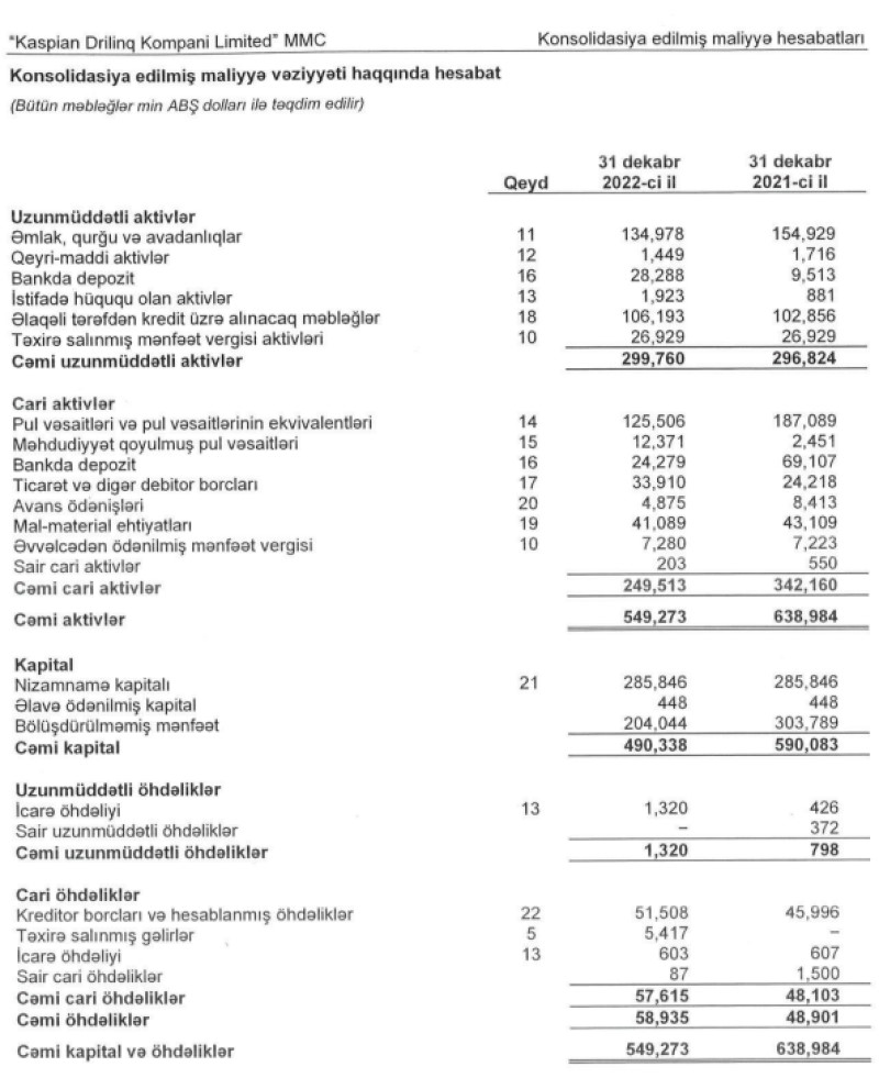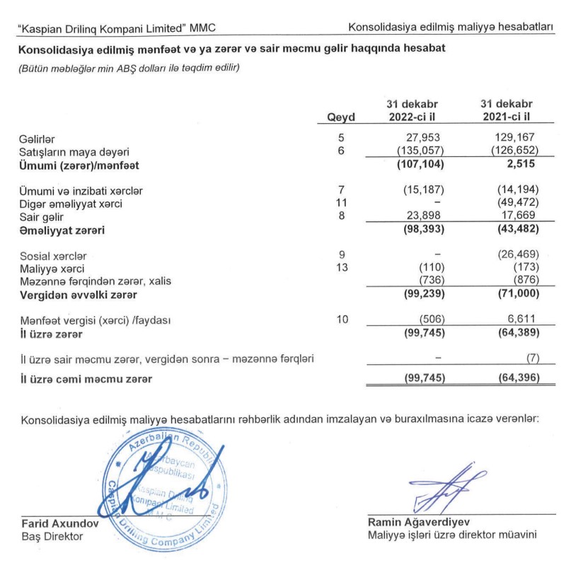 "Kaspian Drillinq Kompani"dən rekord zərərQuyu mühəndisliyi, kompleks layihə idarəetməsi və qazma xidmətləri ilə təmin "Kaspian Drillinq Kompani" MMC şirkəti 2022-ci ili 99 milyon 745 min dollar xalis zərər ilə başa vurub. Şirkət 2021-ci ili 64 milyon 396 dollar xalis zərər ilə bağlamışdı. Beləliklə, ötən il "Kaspian Drillinq Kompani"nin xalis zərəri 35 milyon 349 min dollar və ya 55% artıb.