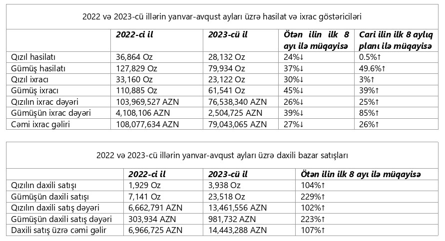 Şirkətdən Marja.az-a verilən məlumata görə, 2023-cü ilin yanvar-avqust aylarında QSC tərəfindən 28.1 min unsiya qızılın hasilatı, 23.1 min unsiya qızılın ixracı həyata keçirilib. Bununla cari ilin ilk 8 ayı üçün müəyyənləşdirilmiş qızıl hasilatı planı 0.5%, qızıl ixracı planı isə 3% artıq icra edilib. Ümumilikdə, cari il üzrə 62.5 min unsiya qızıl hasilatı və ixracı planlaşdırılıb ki, bu da ötən ilin göstəriciləri ilə müqayisədə hasilatda 1%, ixracda isə 4.4% daha artıq hədəfdir.