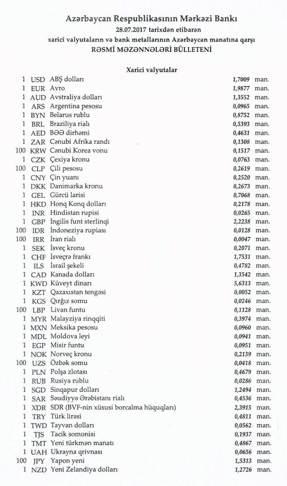İyulun 27-də rəsmi olaraq 1 dollar 1,7010 manata, 1 avro isə 1.9984 manata bərabər idi.
