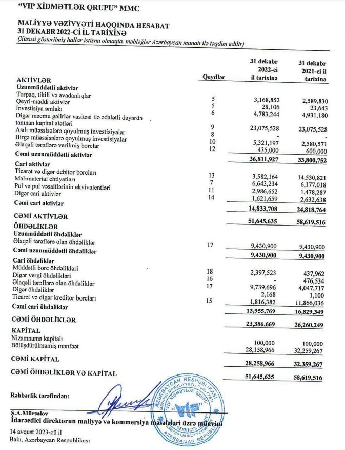 31 dekabr 2022-ci il tarixində “VİP Aviasiya Xidmətləri Şirkəti” 51 milyon 646 min manat cəmi aktivlərə malik olub.