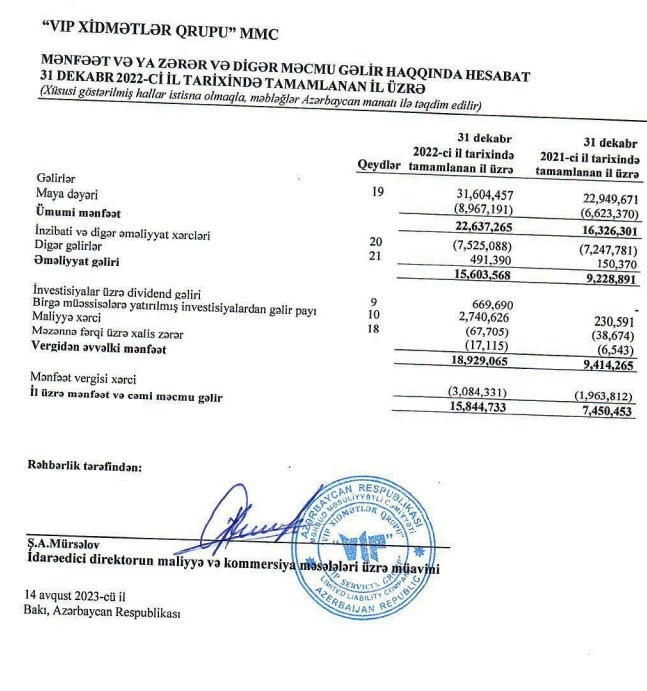 Marja.az Şirkətin maliyyə hesabatlarına istinadən xəbər verir ki, “VİP Aviasiya Xidmətləri Şirkəti” MMC-nin gəlirləri 2021-ci ildə 22 milyon 950 min manat ikən, 2022-ci ildə 31 milyon 604 min manata yüksəlib (8 milyon 554 min manat və ya 37% artıb).