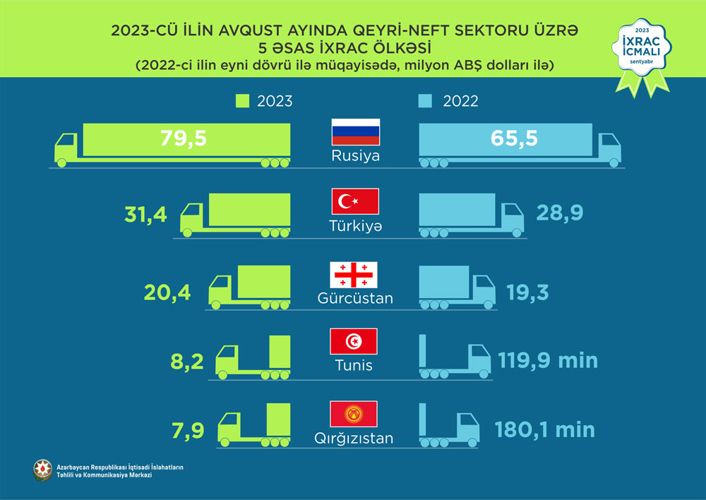 2023-cü ilin avqust ayında qeyri-neft sektoruna aid ən çox mal ixrac edilən ölkələrin siyahısında Rusiya Federasiyası (79,6 milyon ABŞ dolları) birinciliyə yüksəlib. Bu siyahıda Türkiyə (31,4 milyon ABŞ dolları) ikinci və Gürcüstan (20,4 milyon ABŞ dolları) üçüncü olub.