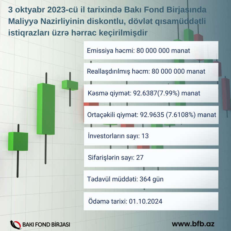 3 oktyabr 2023-cü il tarixində Bakı Fond Birjasında Azərbaycan Respublikasının Maliyyə Nazirliyinin AZ0101030085 ISIN-li, 80 milyon manat həcmində, 364 gün tədavül müddətli diskontlu, dövlət qısamüddətli istiqrazlarının (DQİ) yerləşdirilməsi üzrə hərrac keçirilib.