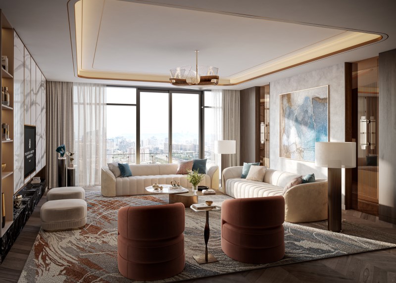 Zərif mərmər, ağac və dəri materialları, ağ, açıq bej, neytral və qəhvəyi rənglərdən ibarət interyer palitrası tonlarında istifadə edilmişdir. Bütün bunlar The Residences-in qonaqpərvərlik ab-havasını, dəbdəbəni və heyrətamiz mənzərələrini özündə əks etdirir.
