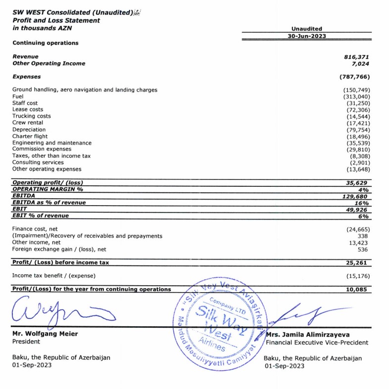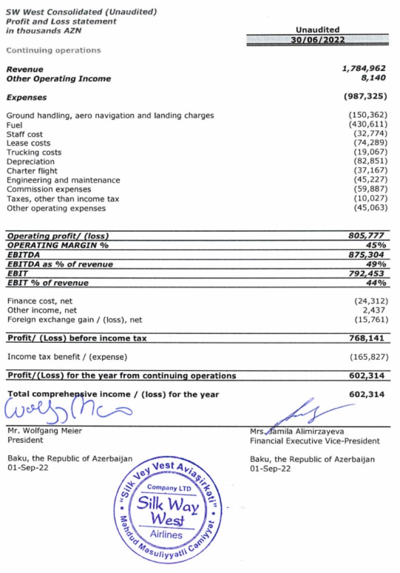 "Silk Vey Vest Aviaşirkəti" MMC 2023-cü ilin birinci yarısnı (yanvar-iyun) 10 milyon 85 min manat xalis mənfəət ilə başa vurub. Şirkət 2022-ci ilin birinci yarısını 602 milyon 314 manat xalis mənfəət ilə bağlamışdı. Beləliklə, "Silk Vey Vest Aviaşirkəti"nin xalis mənfəəti 59,7 dəfə azalıb. Xalis mənfəətin azalması gəlirlərin kəskin azalmasından qaynaqlanır.