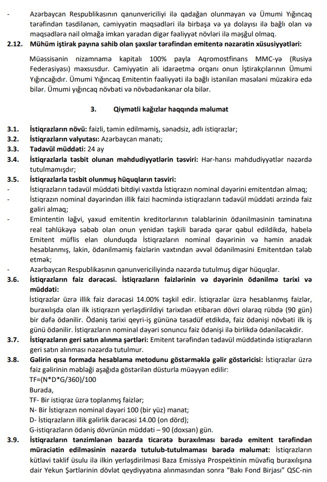 2-ci buraxılış üzrə 500 000 (beş yüz min) manat həcmində, 24 ay, illik 14%;