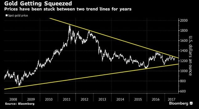 Üçbucaq fiquru, qızılın qiymətinin 2015-ci ilin sonundan bu yana 1050 ilə 1380 dollar səviyyələri arasında qalmasını təmin edib.