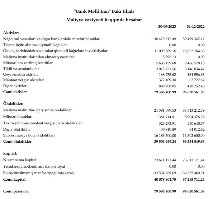 31 Sentyabr 2023-cü il tarixində "Bank Melli İran" Bakı filialı 79 milyon 586 min manat cəmi aktivlərə malik olub. Filial ötən ilin sonunda 96 milyon 620 min manat cəmi aktivlərə malik idi. Bu, Bankın maliyyə institutları qarşısında öhdəlikləri azaldığından nağd vəsaitlərin və müştərilərə verilən kreditlərin azalması ilə əlaqədardır. Bankın kredit portfeli 9 milyon 466 min manatdan 5 miylon 636 min manata geriləyib.