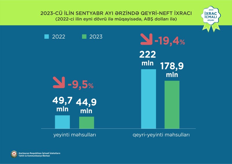 Cari ilin sentyabr ayının qeyri-neft ixracı 223,89 milyon ABŞ dolları olub. Bunun da 44,9 milyon ABŞ dollarını yeyinti məhsulları üzrə ixrac, 178,9 milyon ABŞ dollarını isə qeyri-yeyinti məhsulları üzrə ixrac təşkil edib.