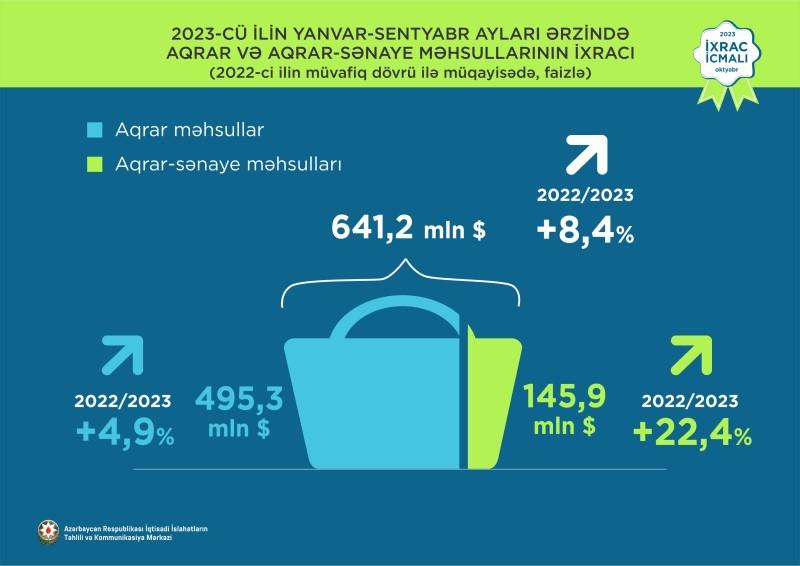 2023-cü ilin yanvar-sentyabr ayları ərzində aqrar və aqrar-sənaye məhsulları üzrə birgə ixracın statistik dəyəri 8,4% artaraq 641,2 milyon ABŞ dolları təşkil edib. Qeyri-neft/qaz ixracının tərkib hissəsində əhəmiyyətli yer tutan aqrar-sənaye məhsullarının yaratdığı dəyər ötən ilin müvafiq dövrü ilə müqayisədə 22,4% artaraq 145,9 milyon ABŞ dolları təşkil edib.