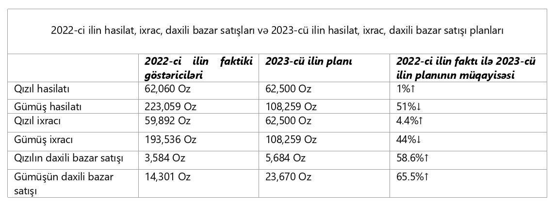 2023-cü ilin yanvar-sentyabr ayları ərzində (9 ayda) ötən ilin eyni dövrü ilə müqayisə “AzerGold” şirkətinin qızıl hasilatı 10% azalaraq 38 min 341 unsiya, gümüş hasilatı isə 36% azalaraq 89 min 437 unsiya təşkil edir.
