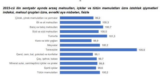 2023-cü ilin sentyabr ayında ərzaq məhsulları, içkilər və tütün məmulatları üzrə istehlak qiymətləri indeksi əvvəlki aya nisbətən 0,6 faiz, əvvəlki ilin sentyabr ayına nisbətən 4,5 faiz artıb.
