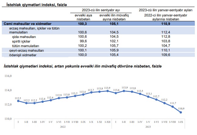 Azərbaycanda illik inflyasiyanın tempi avqustdakı 8 faizdən sentyabrda 5,1%-ə düşüb. İllik inflyasiya iyuldakı 9,4 faizdən avqustda 8 faizə geriləmişdi.2023-cü ilin yanvar-sentyabr aylarında istehlak qiymətləri indeksi (inflyasiya göstəricisi) 2022-ci ilin yanvar-sentyabr aylarına nisbətən 10,9 faiz, o cümlədən ərzaq məhsulları, içkilər və tütün məmulatları üzrə 12,4 faiz, qeyri-ərzaq məhsulları üzrə 10,1 faiz, əhaliyə göstərilmiş ödənişli xidmətlər üzrə 9,6 faiz artıb.
