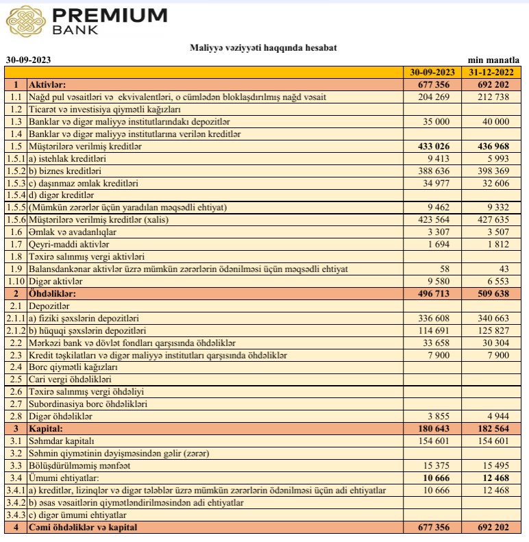 30 sentyabr 2023-cü il tarixində “Premium Bank” 677 milyon 356 min manat cəmi aktivlərə, o cümlədən 433 milyon 26 min manat kredit portfelinə (müştərilərə verilmiş kreditlər) malik olub. Bank ötən ilin sonunda 692 milyon 202 min manat cəmi aktivlərə, o cümlədən 436 milyon 968 min manat kredit portfelinə malik idi.