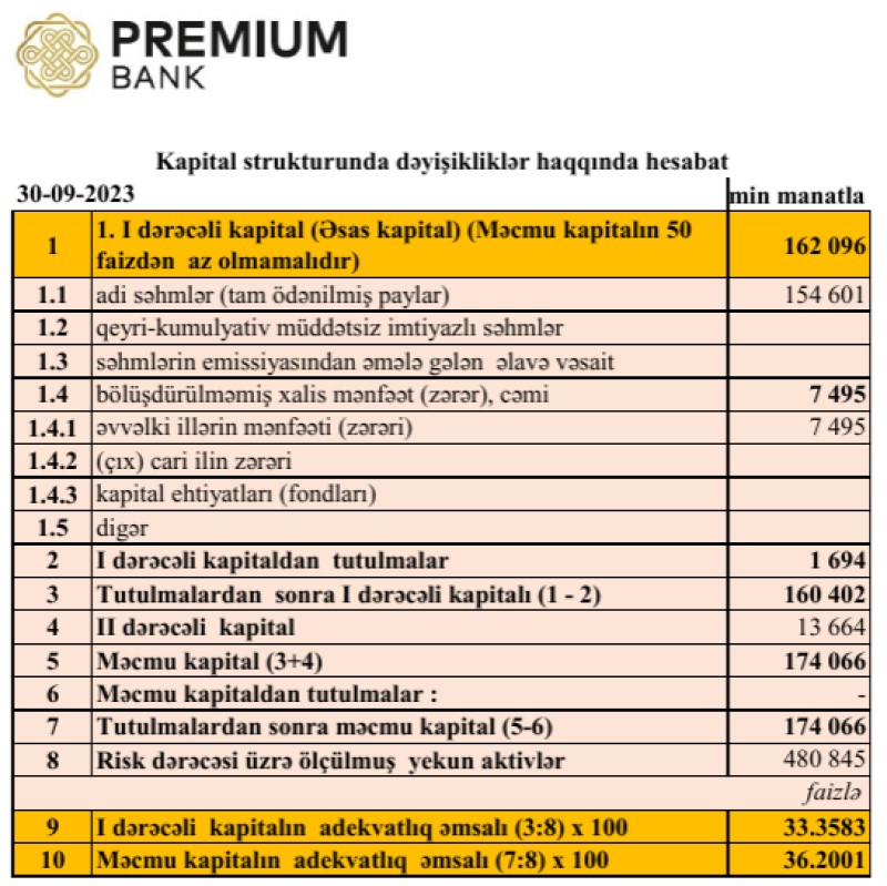 30 sentyabr 2023-cü il tarixində “Premium Bank” 174 milyon 66 min manat məcmu kapitala malik olub.