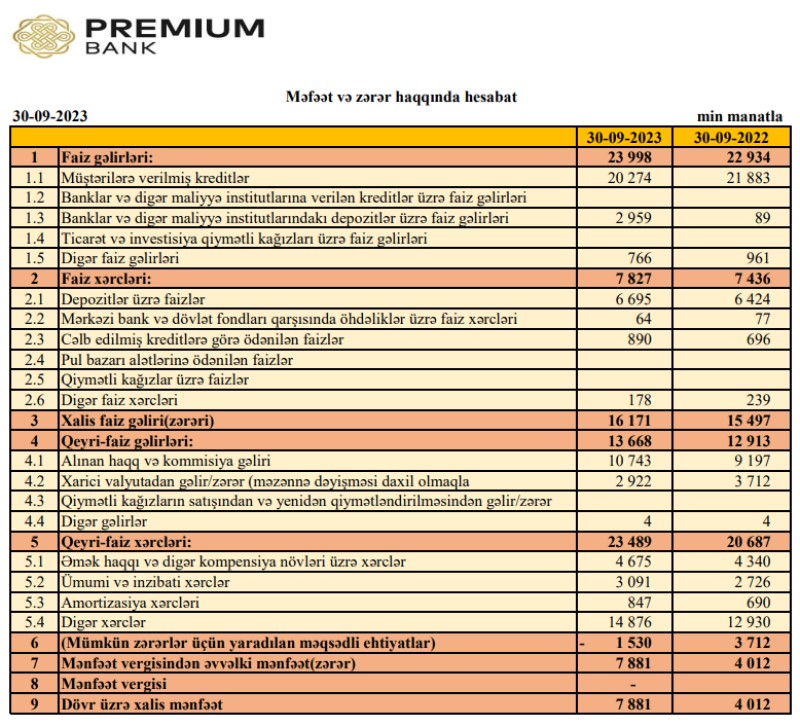 2023-cü ilin 9 ayı ərzində “Premium Bank”ın cəmi əməliyyat gəlirləri (faiz və qeyri-faiz gəlirləri) 37 milyon 666 min manat, cəmi əməliyyat xərcləri (faiz və qeyri-faiz xərcləri) 31 milyon 316 min manat, gəlirlər xərcləri üstələdiyindən əməliyyat mənfəəti 6 milyon 350 min manat təşkil edib. Eyni zamanda, mümkün zərərlər üçün yaradılan məqsədli ehtiyatlardan azad olmuş 1 milyon 530 min manat mənfəətə əlavə olunub.