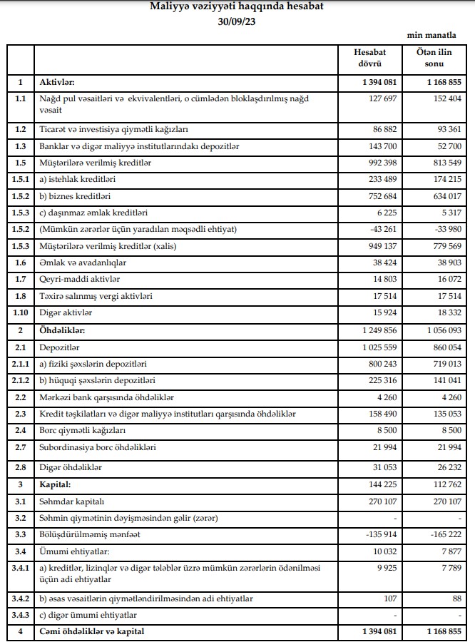 "AccessBank"ın kredit portfeli (müştərilərə verilən kreditlər) 2023-cü ilin 9 ayında ötən ilin sonu ilə müqayisədə 178 milyon 849 min manat artaraq 30 sentyabr 2023-cü il tarixində 992 milyon 398 min manata çatıb.