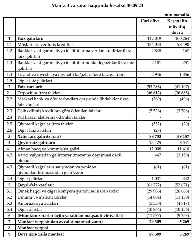 "AccessBank" QSC 2023-cü ilin 9 ayını (yanvar-sentyabr) 29 milyon 309 min manat xalis mənfəət ilə başa vurub. Bank ötən ilin eyni dövrünü 5 milyon 269 min manat xalis mənfəət ilə bağlamışdı. Beləliklə, 2023-cü ilin 9 ayında ötən ilin eyni dövrü ilə müqayisədə "AccessBank"ın xalis mənfəəti 5,6 dəfə artıb.