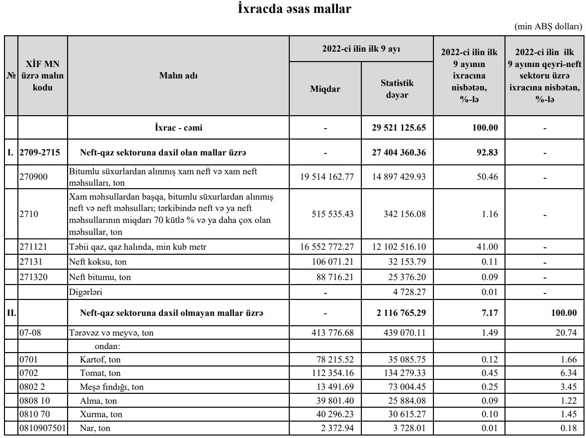 Müqayiə üçün qeyd edək ki, 2022-ci ilin ilk 9 ayı ərzində Azərbaycandan 14 milyard 897 milyon 429 min dollarlıq xam neft və xam neft məhsulları, 12 milyard 102 milyon 516 min dollarlıq təbii qaz ixrac olunmuşdu. Beləliklə, xam neft və xam neft məhsullarınln ixracından gəlirlər 18,6%, təbii qaz ixracından gəlirlər isə 5,7% azalıb.