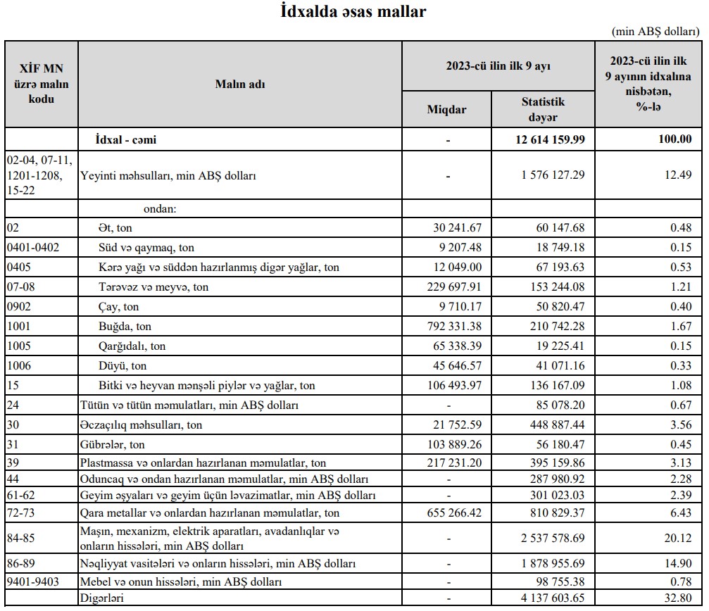 2023-cü ilin yanvar-sentyabr aylarında Azərbaycanın ən çox ixrac və idxal etdiyi mallar.