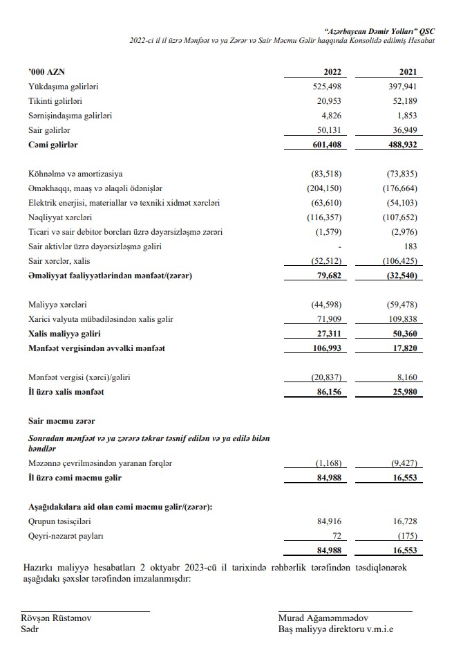 Marja.az “Azərbaycan Dəmir Yolları” QSC-nin 31 dekabr 2022-ci il tarixində tamamlanan il üzrə Konsolidə edilmiş Maliyyə Hesabatlarına istinadən xəbər verir ki, 2021-ci ildə şirkətin cəmi əsas əməliyyat gəlirləri 488 milyon 932 min manat ikən, 2022-ci ildə 601 miylon 408 min manata yüksəlib (112 milyon 476 min manat və ya 23% artıb).
