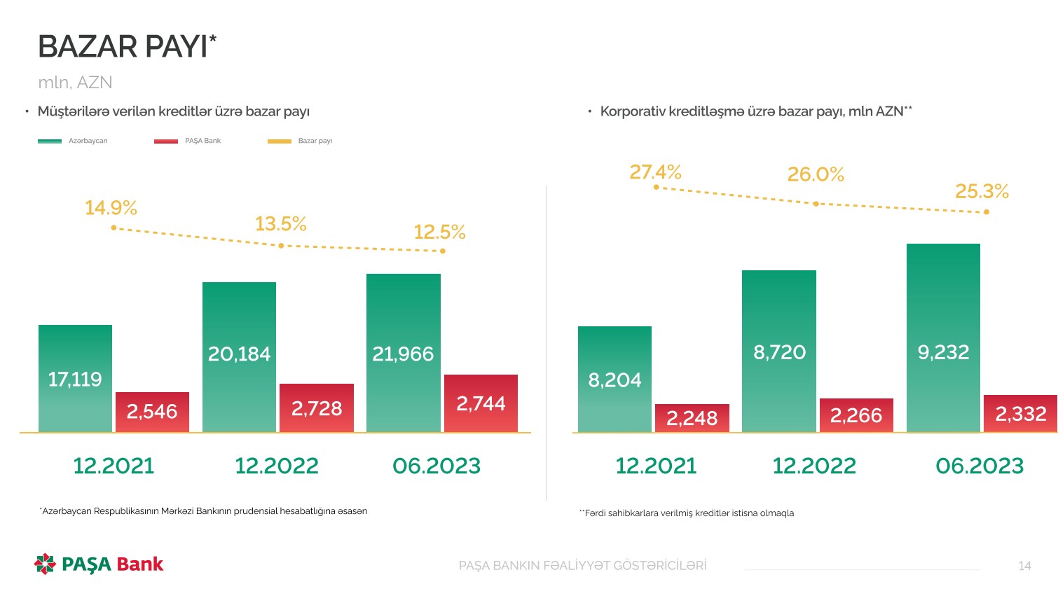 Süleymanov bildirib ki, 30 iyun 2023-cü il tarixində "PAŞA Bank"ın bazar payları - aktivlər üzrə 18.5%, müştərilərə verilən kreditlər üzrə 12.5%, o cümlədən korporativ kreditləşmə üzrə 25.3%, depozitlər üzrə 19.5% təşkil edib.