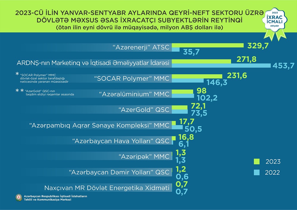 Marja.az xəbər verir ki, “İxrac icmalı” tərəfindən qeyri-neft sektoru üzrə 2023-cü ilin yanvar-sentyabr aylarında həyata keçirilmiş ixracla bağlı həm qeyri-dövlət, həm də dövlətə məxsus ixracatçı subyektlərin reytinqi tərtib edilib.