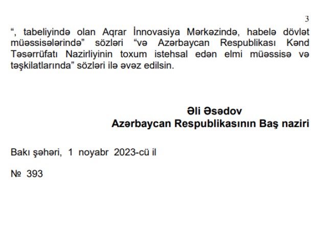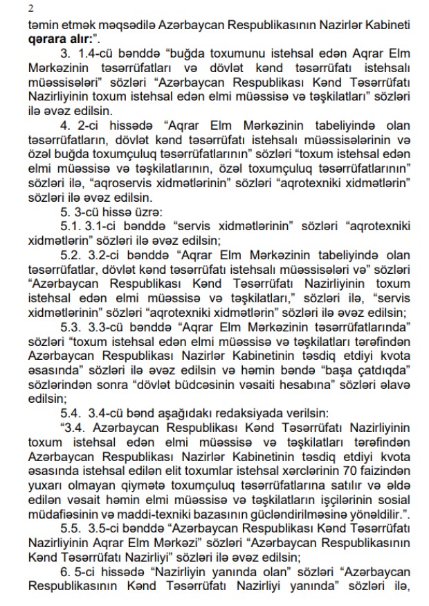 Dəyişikliyə əsasən, Kənd Təsərrüfatı Nazirliyinin toxum istehsal edən elmi müəssisə və təşkilatları tərəfindən Nazirlər Kabinetinin təsdiq etdiyi kvota əsasında istehsal edilən elit toxumlar istehsal xərclərinin 70 faizindən yuxarı olmayan qiymətə toxumçuluq təsərrüfatlarına satılır və əldə edilən vəsait həmin elmi müəssisə və təşkilatların işçilərinin sosial müdafiəsinin və maddi-texniki bazasının gücləndirilməsinə yönəldiləcək.