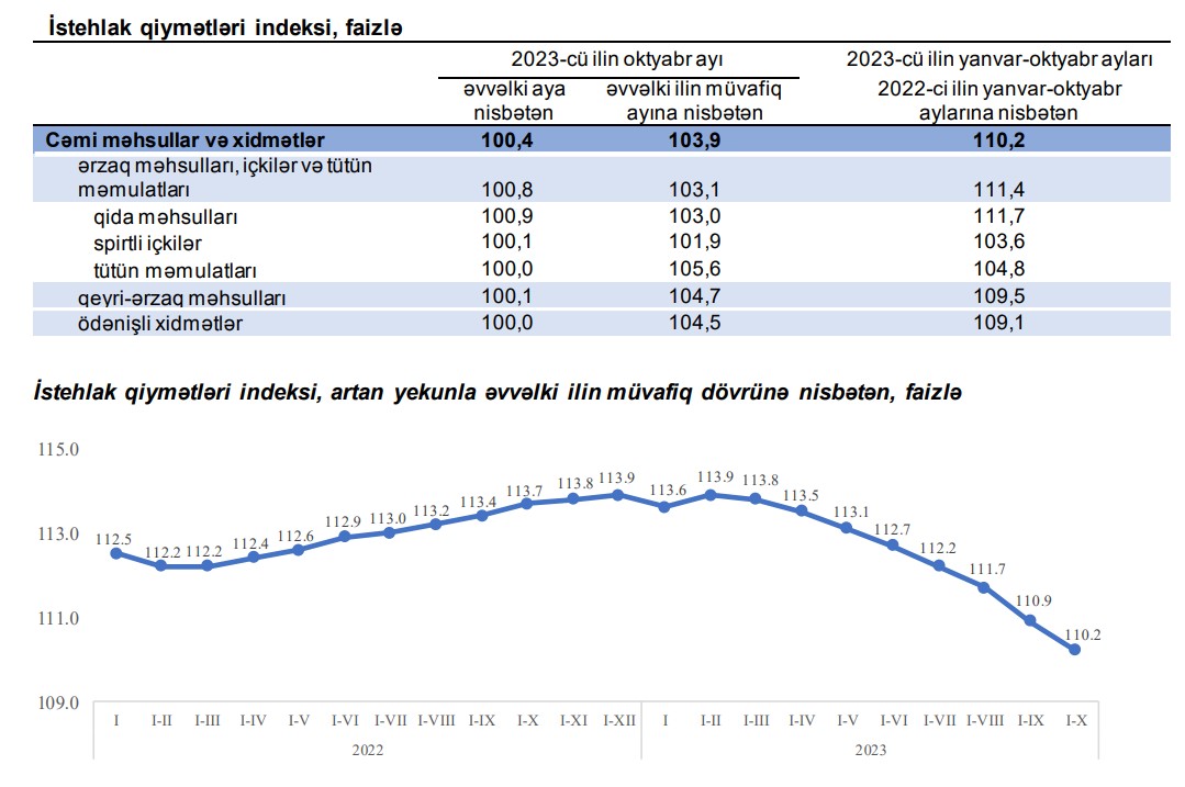 Azərbaycanda illik inflyasiyanın sürəti sentyabrdakı 5,1 faizdən oktyabrda 3,9 faizə düşüb. İlik inflyasiyanın tempi avqustda 8 faizdən sentyabrda 5,1%-ə düşmüşdü.2023-cü ilin yanvar-oktyabr aylarında istehlak qiymətləri indeksi (inflyasiya göstəricisi) 2022-ci ilin yanvar-oktyabr aylarına nisbətən 10,2 faiz, o cümlədən ərzaq məhsulları, içkilər və tütün məmulatları üzrə 11,4 faiz, qeyri-ərzaq məhsulları üzrə 9,5 faiz, əhaliyə göstərilmiş ödənişli xidmətlər üzrə 9,1 faiz artıb.