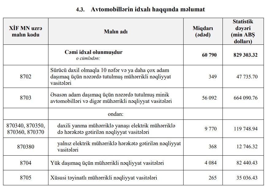 2022-ci ilin 10 ayı ərzində Azərbaycana 829 milyon 303 min dollar dəyərində 60 min 790 ədəd avtomobil idxal edilmişdi.