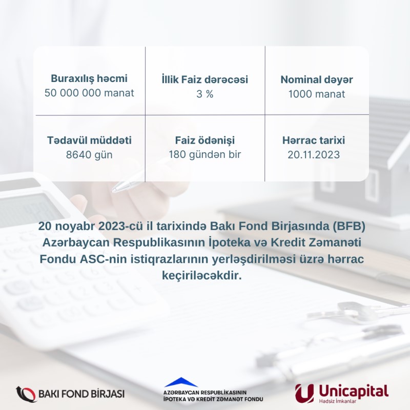20 noyabr 2023-cü il tarixində Bakı Fond Birjasında (BFB) Azərbaycan Respublikasının İpoteka və Kredit Zəmanəti Fondu istiqrazlarının yerləşdirilməsi üzrə hərrac keçiriləcəkdir. Hərrac zamanı sifarişlərin toplanması BFB-nin ticarət reqlamentinə uyğun olaraq saat 11:00-dan 12:30-dək təşkil olunacaqdır.